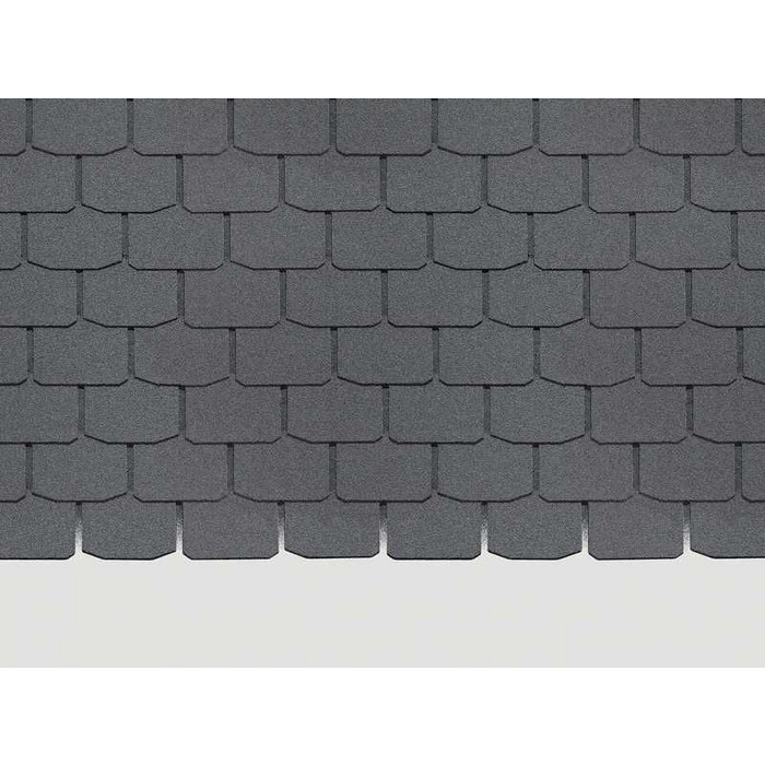 Гонты глубокого серого цвета с лепестками традиционной формы отлично подходят для оформления крыш сложной конфигурации. Черепица подчеркивает красоту деталей, при этом делает кровлю визуально более компактной. Она идеально сочетается с нейтральными светлыми оттенками и фасадами более насыщенных тонов.