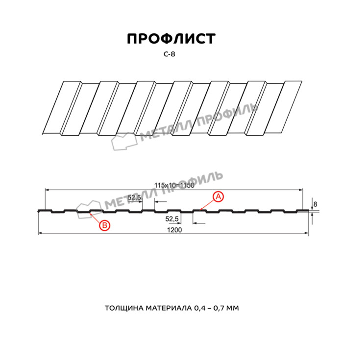 Профиль с наиболее маленькой волной в линейке Компании Металл Профиль. Назначение профиля С-8 – скорее дизайнерская функция, нежели прочностная. С-8 замечательно справляется с такими задачами, как: внутренняя облицовка индустриальных строений, системы подвесных потолков, постройка ограждений, не подверженных большим снеговым и ветровым нагрузкам, создание вентилируемых фасадов. Аналогичная с обеих сторон форма проката делает С-8 универсальным сырьём для различных дизайнерских замыслов. Оптимальная толщина стали – от 0,4 до 0,7 мм позволяет объектам из профлиста отлично справляться с любым своим назначением. А большая полезная ширина (1150 мм) помогает сэкономить на закупке профлистов. По вашему заказу мы можем изготовить листы металлопроката длиной от 0,5 до 12 метров.