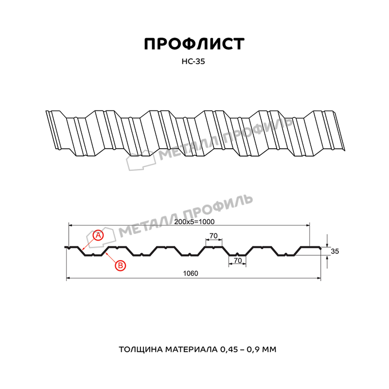 Универсальный и выгодный материал с одинаковым с обеих сторон профилем. Маркировка НС означает, что профилированный лист этот – и «несущий», и «стеновой». Он пользуется популярностью как для гражданского строительства, так и для индустриальных объектов. Из профнастила с глубиной волны в 35 мм получаются конструкции совершенно разного назначения: обустройство кровли, ограждения частных и общественных территорий, быстровозводимые сооружения ( павильоны, навесы ), каркасные здания ( цеха, склады, торговые центры ). Хорошую несущую способность НС-35 придают добавочные канавки, которые расположены с обеих сторон профлиста. Полезная ширина профнастила НС-35 достигает 1000 мм при полной ширине 1060 мм, получается, что при монтаже этого профиля в боковое соединение уйдёт 60 мм. Толщина стали может быть выбрана в диапазоне от 0,5 до 0,9 мм – это влияет не только на механическую прочность профнастила, но и его тяжесть. Полимерное покрытие из каталога Компани Металл Профиль придаст профлисту дополнительную неуязвимость к ржавению и солнечному излучению.